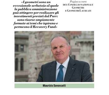 I Geometri Italiani sono un eccezionale serbatoio al quale la Pubblica Amministrazione può attingere per realizzare gli investimenti previsti dal PNRR, sono risorse ampiamente formate ai temi che ispirano e permeano il recovery Found: così Maurizio Savoncelli Presidente del Consiglio Nazionale dei Geometri e Geometri Laureati, in un’intervita pubblicata sul quotidiano Italia Oggi. ITALIA_OGGI.pdf