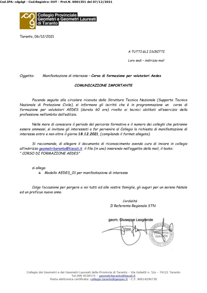 Si pubblica comunicazione a firma del Presidente del Collegio Provinciale di Taranto – Referente Regionale STN – per manifestazione di interesse Corso di Formazione Valutatori Aedes (scadenza presentazione domande 18.12.2021). In allegato è presente anche il modello da compilare ed inviare alla segreteria del Collegio. MODELLO_AEDES_01_PER_MANIFESTAZIONE_DI_INTERESSE.pdf