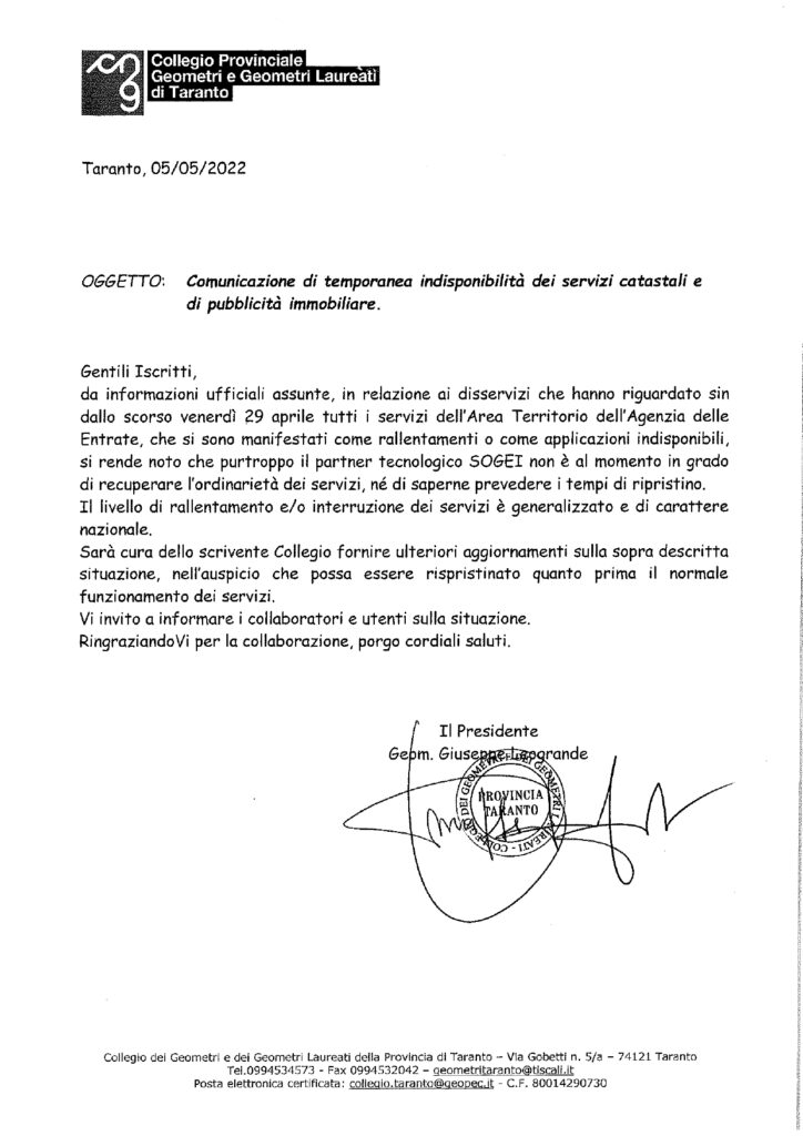 Pubblichiamo la comunicazione a firma del Presidente del Collegio dei Geometri e Geometri Laureati della Provincia di Taranto, Geom. Giuseppe LEOGRANDE, relativa a quanto specificato in oggetto. comunicazione_indisponibilita_servizio_catastali_2.pdf