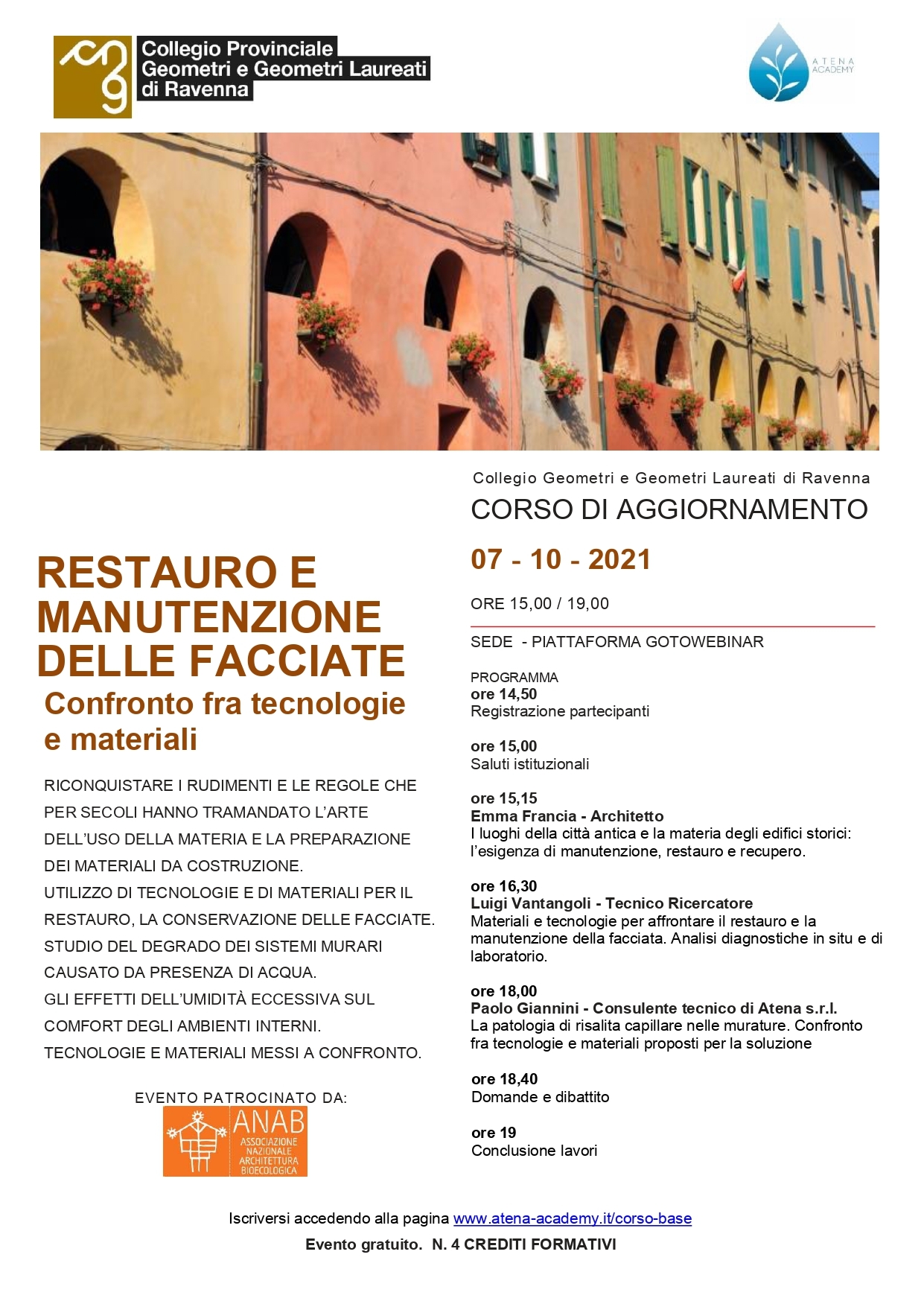 Il Collegio Provinciale dei Geometri e dei Geometri Laureati della Provincia di Ravenna, in collaborazione con Atena Academy ha organizzato un Corso di aggiornamento dal titolo ” Restauro e manutenzione delle Facciate -Confronto fra Tecnologie e materiali”