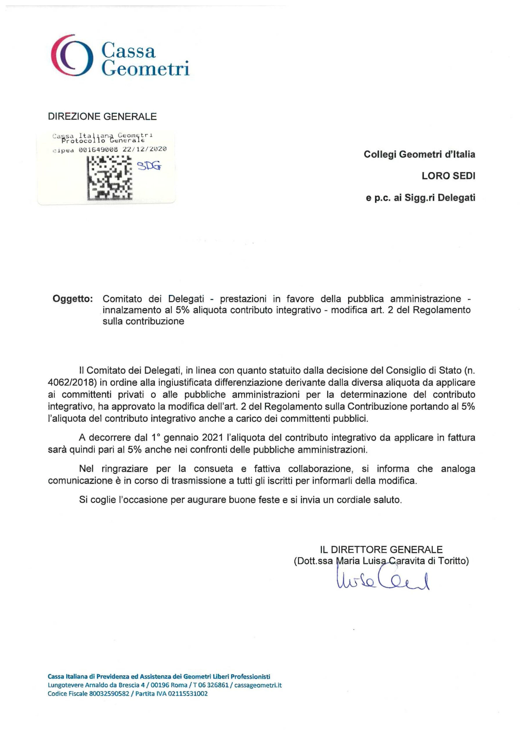Il Comitato dei Delegati presso Cassa Geometri ha approvato la modifica ( dal 1 Gennaio 2021) dell’articolo 2 del regolamento sulla contribuzione portando al 5% l’aliquota del contributo integrativo da applicare il fattura anche nei confronti delle Pubbliche Amministrazioni.